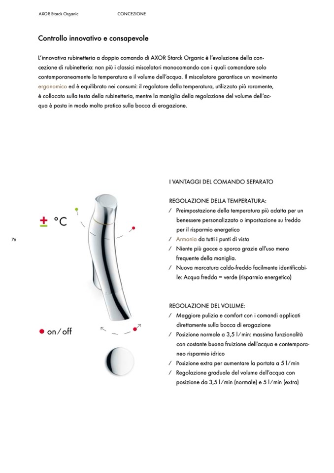 contemporaneamente la temperatura e il volume dell’acqua. Il miscelatore garantisce un movimento