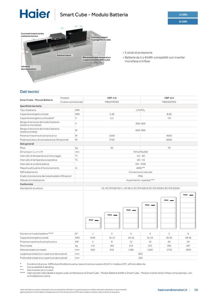 **** I dati riportati nella tabella si basano sulla combinazione di Smart Cube - Modulo Batteria 8 kWh e Smart Cube - Modulo inverter ibrido trifase come esempio, con