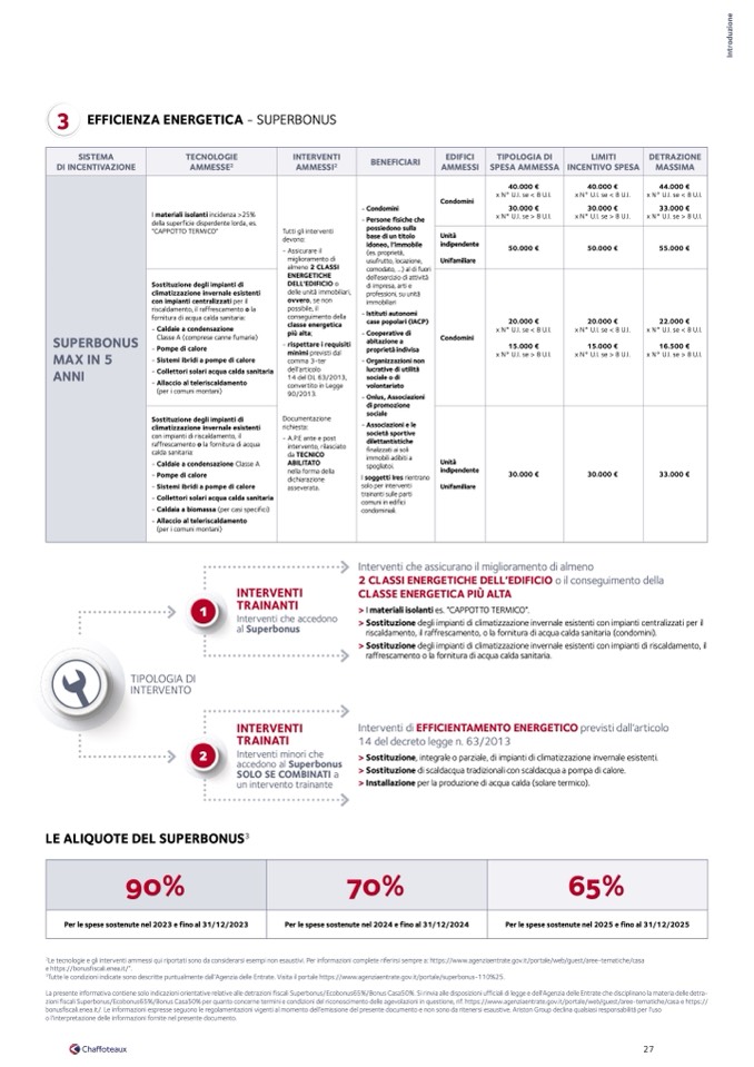 Le tecnologie e gli interventi ammessi qui riportati sono da considerarsi esempi non esaustivi. Per informazioni complete riferirsi sempre a: https://www.agenziaentrate.gov.it/portale/web/guest/aree-tematiche/casa