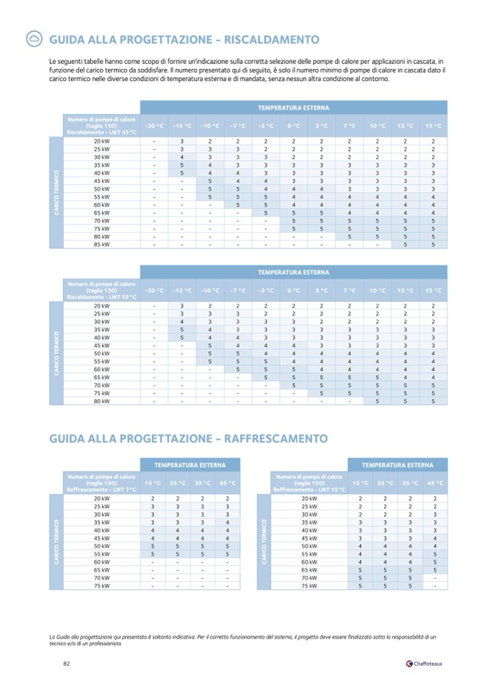 Le seguenti tabelle hanno come scopo di fornire un’indicazione sulla corretta selezione delle pompe di calore per applicazioni in cascata, in