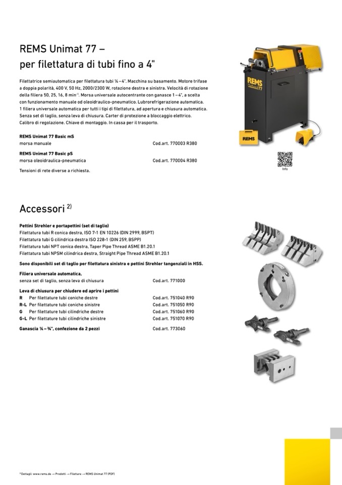 Dettagli: www.rems.de → Prodotti → Filettare → REMS Unimat 77 (PDF)