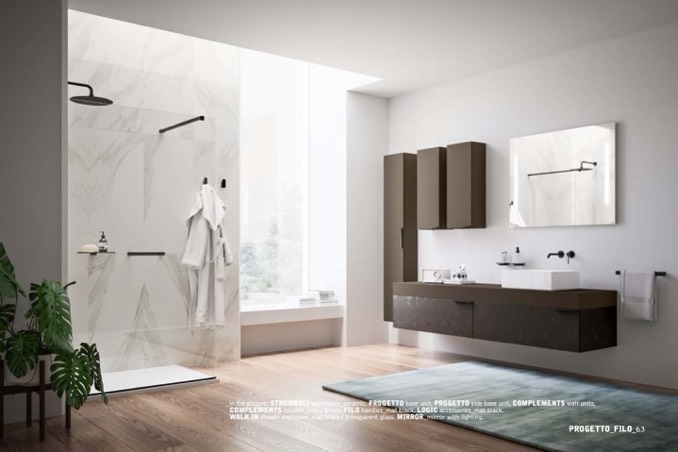 _in the picture: STROMBOLI washbasin_ceramic. PROGETTO base unit, PROGETTO side base unit, COMPLEMENTS wall units,