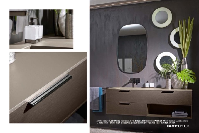 _in the picture: LEONARDO washbasin_HPL. PROGETTO base unit, PROGETTO side base unit_pietra chiara