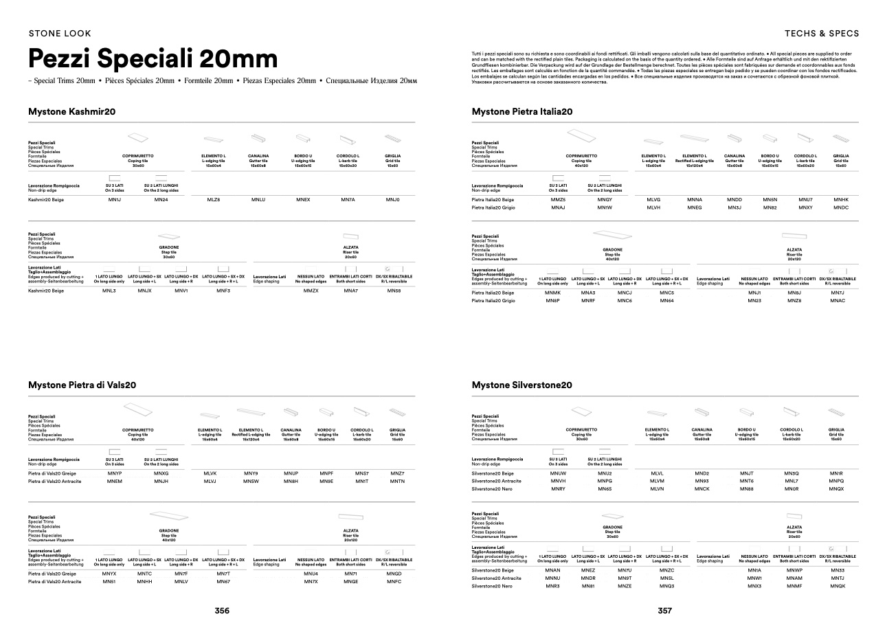 Tutti i pezzi speciali sono su richiesta e sono coordinabili ai fondi rettificati. Gli imballi vengono calcolati sulla base del quantitativo ordinato. • All special pieces are supplied to order