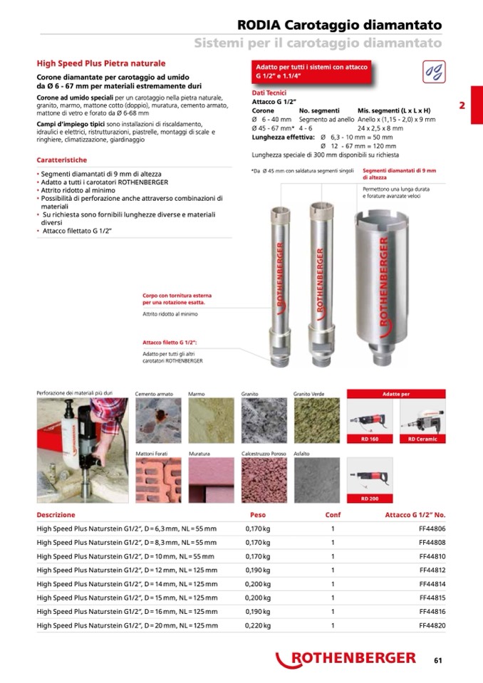 Corone ad umido speciali per un carotaggio nella pietra naturale,