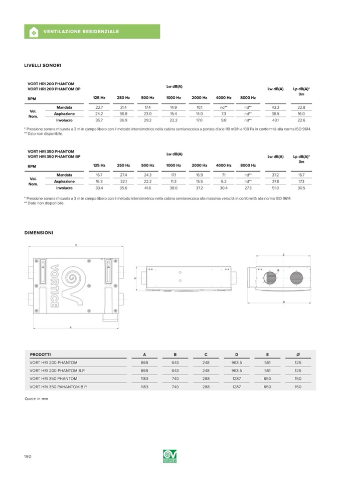 * Pressione sonora misurata a 3 m in campo libero con il metodo intensimetrico nella cabina semianecoica a portata d’aria 110 m3/h a 100 Pa in conformità alla norma ISO 9614.