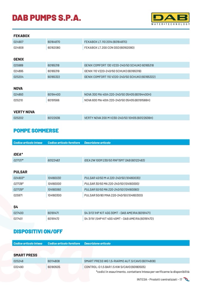 *codici in esaurimento, contattare Intesa per verificarne la disponibilità