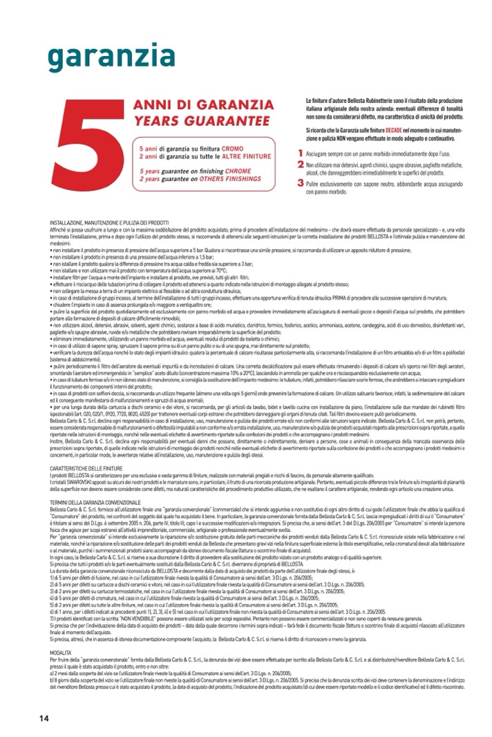 Bellosta Carlo & C. S.r.l. declina ogni responsabilità in caso di installazione, uso, manutenzione e pulizia dei prodotti errate e/o non conformi alle istruzioni sopra indicate. Bellosta Carlo & C. S.r.l. non potrà, pertanto,