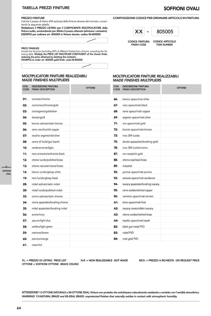 WARNING! 13-NATURAL BRASS and 88-SISAL BRASS: unprotected finishes that naturally oxidise in contact with atmospheric humidity.