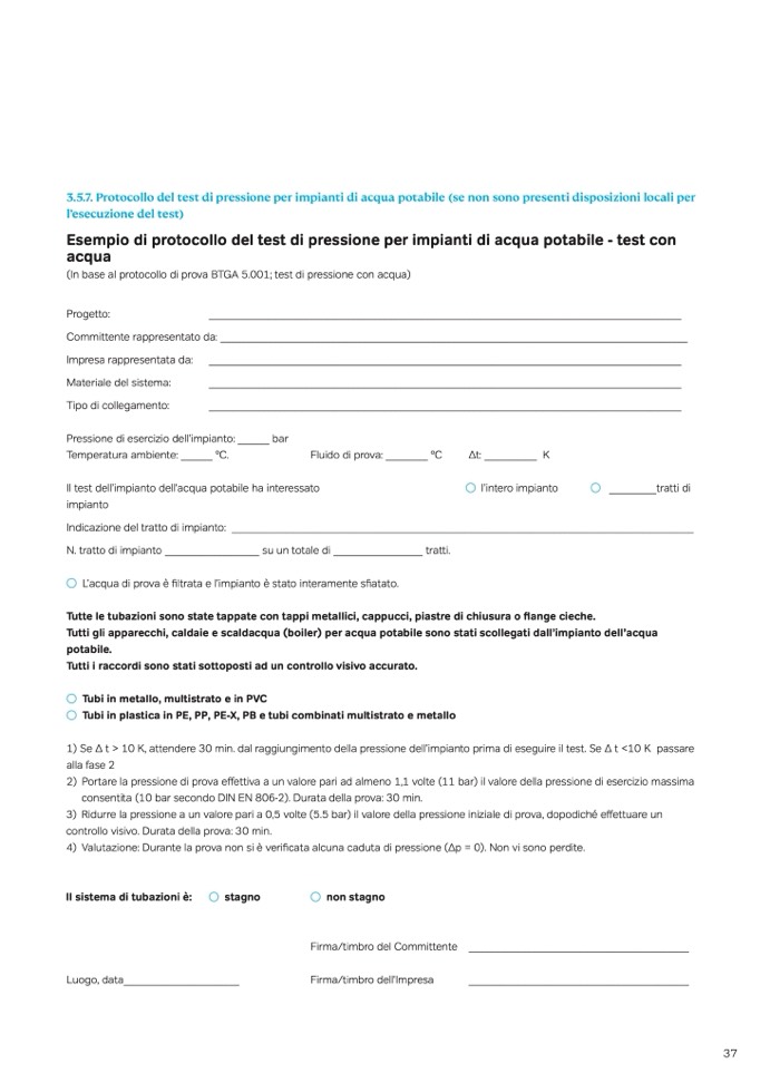 3.5.7. Protocollo del test di pressione per impianti di acqua potabile (se non sono presenti disposizioni locali per