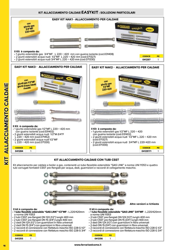 Kit allacciamento per caldaie e boiler a gas, contenenti un tubo flessibile estensibile “GAS LINK” a norma UNI 11353 e quattro