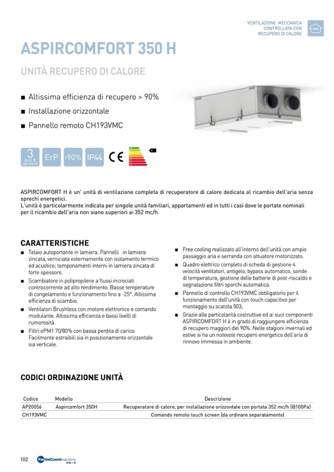 ASPIRCOMFORT H è un' unità di ventilazione completa di recuperatore di calore dedicata al ricambio dell'aria senza