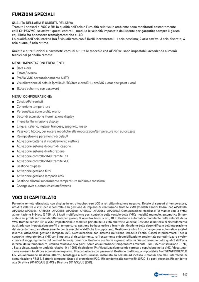 VMC tramite sensori RH o VOC; Impostazione e modifica portata della VMC alle varie velocità; Gestione di batteria di riscaldamento