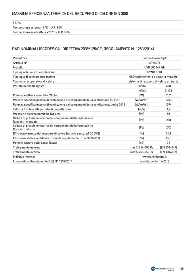 Efficienza statica ventilatori (come da regolamento UE n. 327/2011)