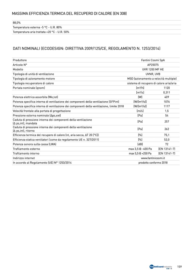 Efficienza statica ventilatori (come da regolamento UE n. 327/2011)