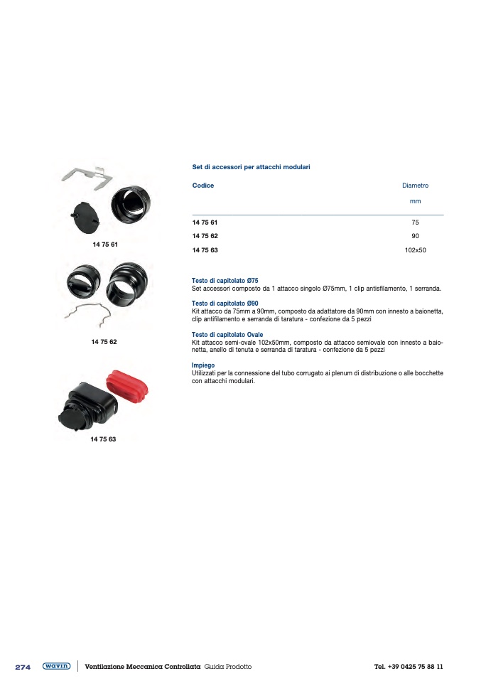 Set accessori composto da 1 attacco singolo Ø75mm, 1 clip antisfilamento, 1 serranda.