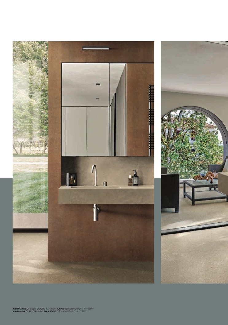 wall: FORGE 01 matte 120x280 471/4"x1101/4" CURE 03 matte 120x240 471/4"x941/2"