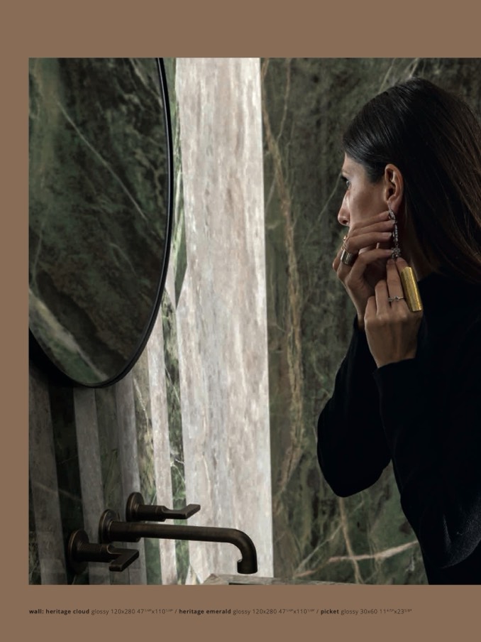 wall: heritage cloud glossy 120x280 471/4”x1101/4” / heritage emerald glossy 120x280 471/4”x1101/4” / picket glossy 30x60 114/5”x235/8”
