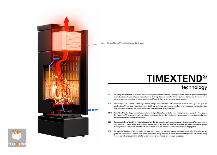 Thanks to its 35 kg thermal mass, the heat is retained during the combustion process and released gradually over
