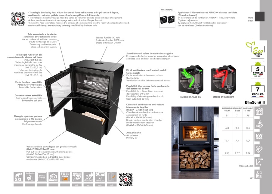 •Tecnologia Smoke by Pass riduce l’uscita di fumo nella stanza ad ogni carica di legna,