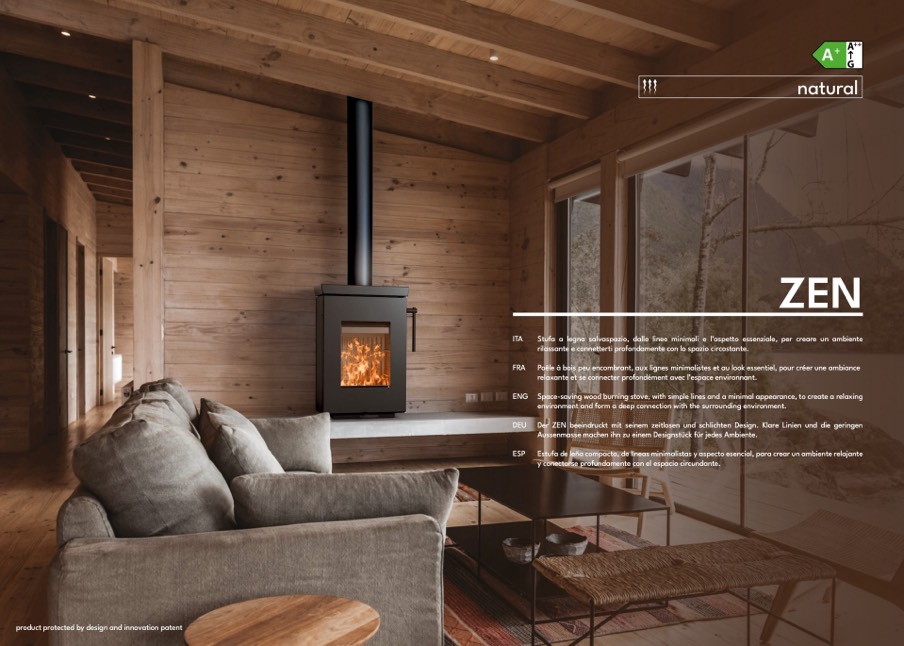 ESP Estufa de leña compacta, de líneas minimalistas y aspecto esencial, para crear un ambiente relajante