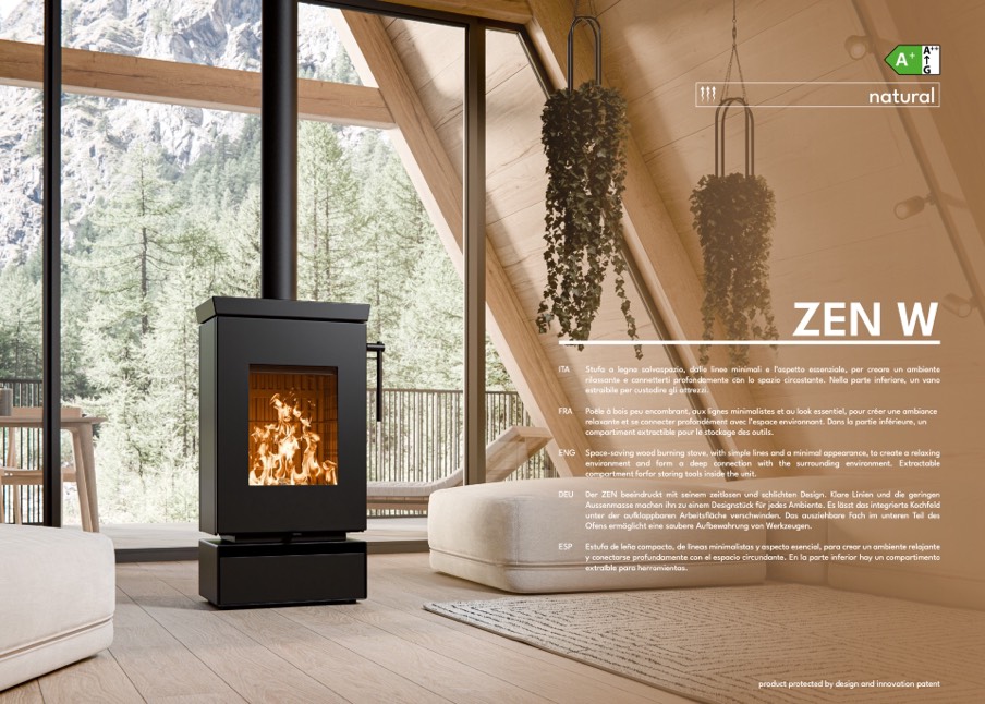 ESP Estufa de leña compacta, de líneas minimalistas y aspecto esencial, para crear un ambiente relajante