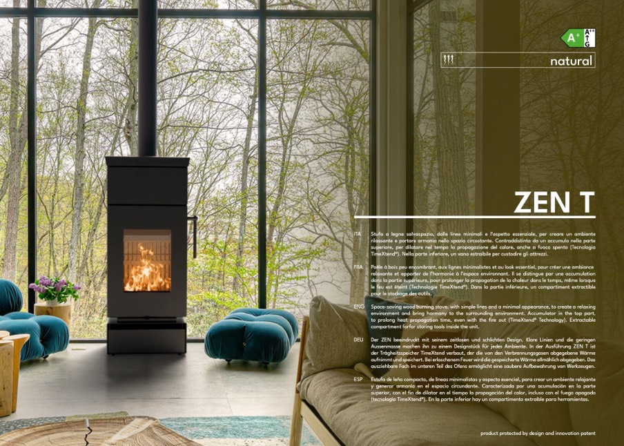 ENG Space-saving wood burning stove, with simple lines and a minimal appearance, to create a relaxing
