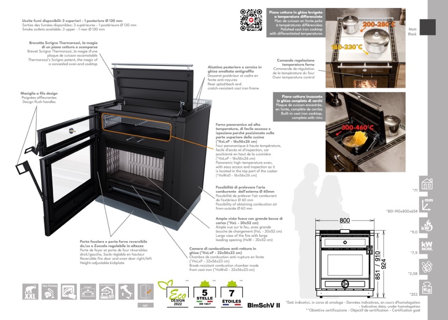Uscite fumi disponibili: 3 superiori - 1 posteriore Ø 130 mm