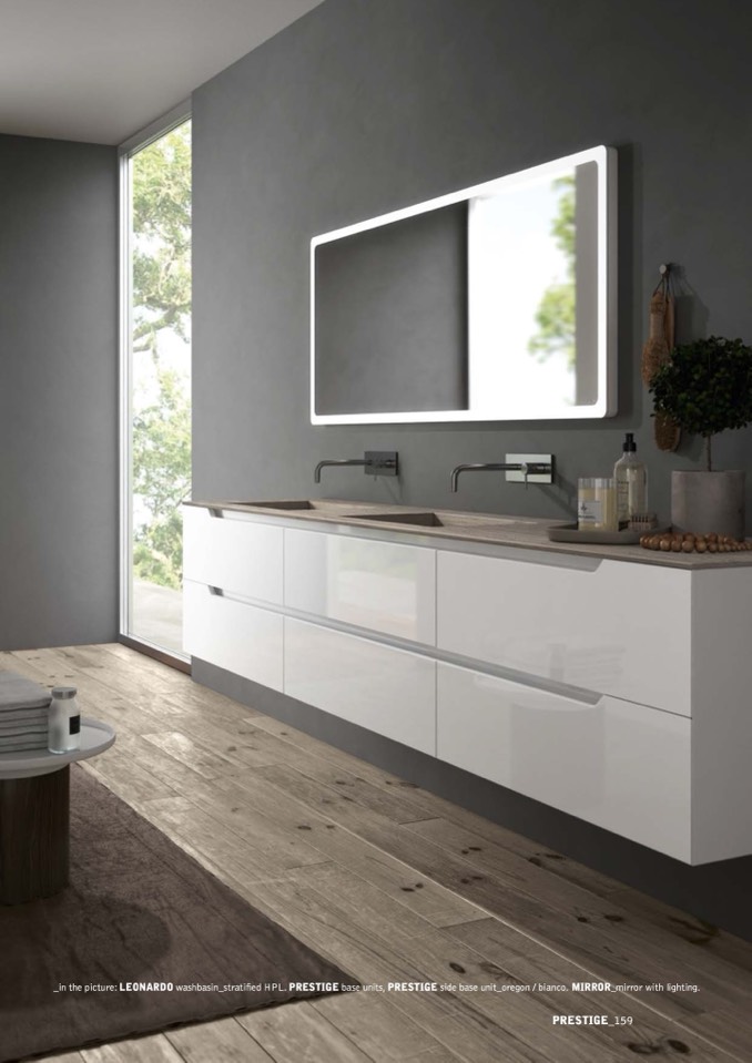 _in the picture: LEONARDO washbasin_stratified HPL. PRESTIGE base units, PRESTIGE side base unit_oregon / bianco. MIRROR_mirror with lighting.