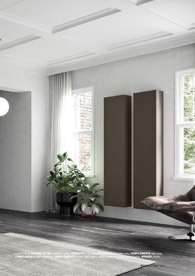 _in the picture: DHARMA VETRO washbasin_glass. PERFETTO+ base unit, PERFETTO+ side base units, COMPLEMENTS wall units,