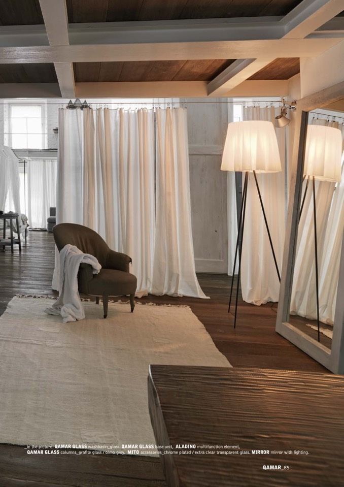 QAMAR GLASS columns_grafite glass / olmo grey. MITO accessories_chrome plated / extra clear transparent glass. MIRROR mirror with lighting.