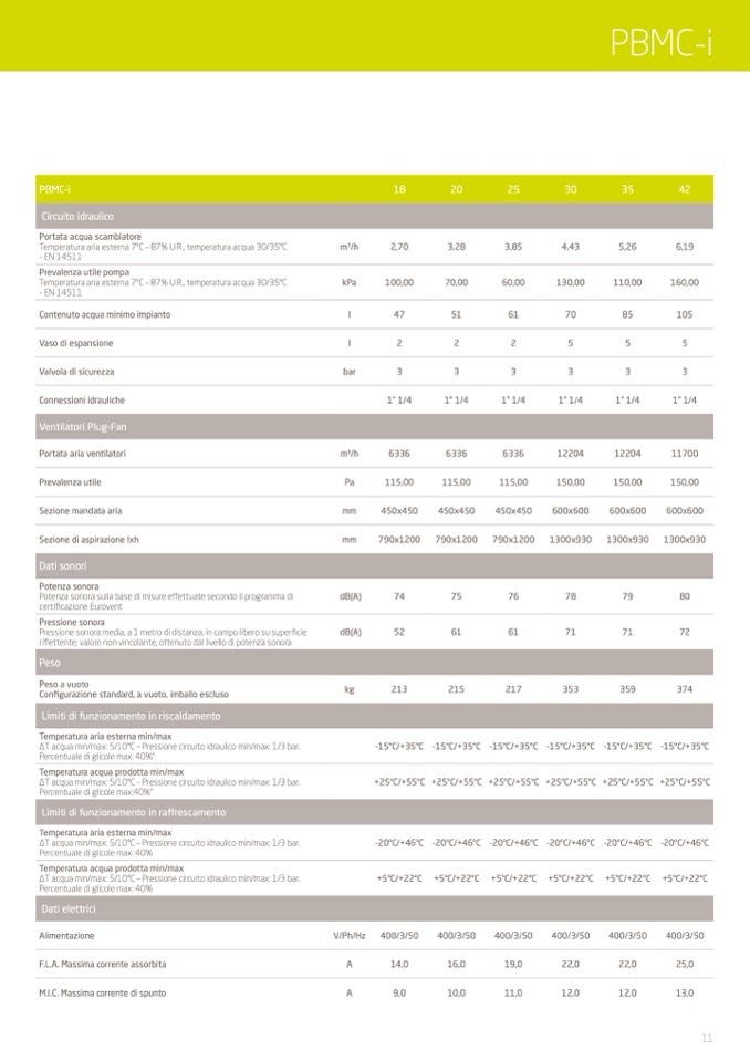 ∆T acqua min/max: 5/10°C – Pressione circuito idraulico min/max: 1/3 bar.