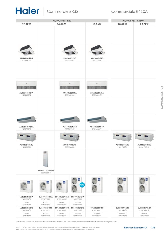 I kW/Btu espressi sono di classificazione in raffrescamento. Per i valori esatti consultare le tabelle dati tecnici dei singoli modelli.