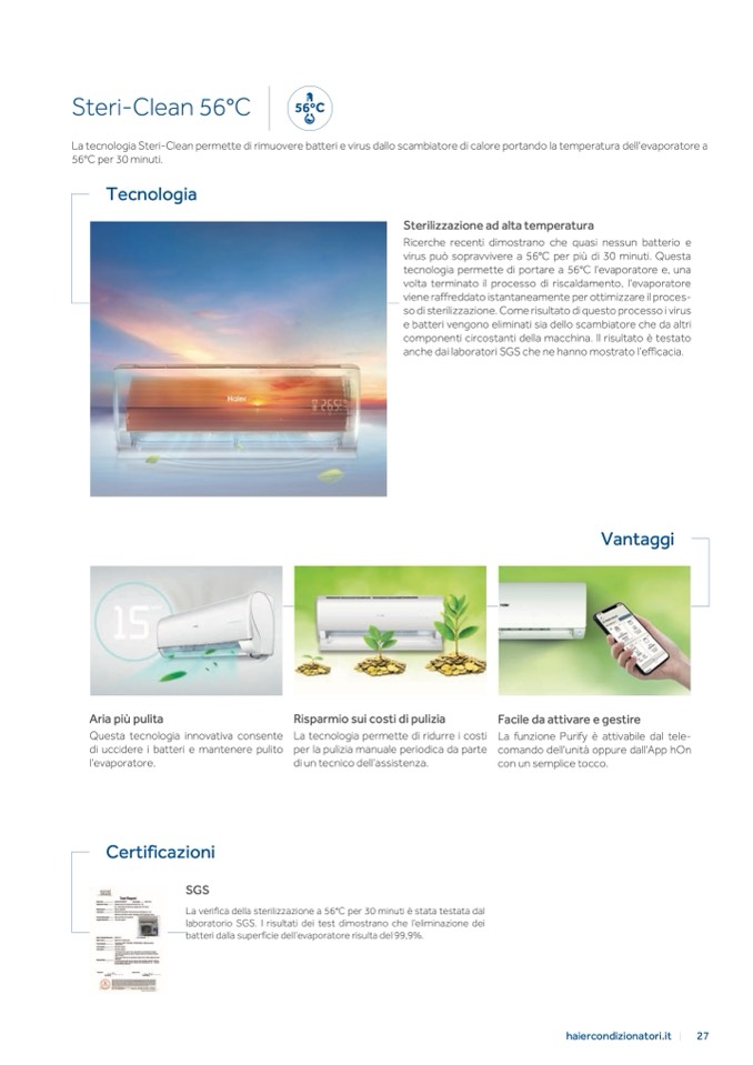 La tecnologia Steri-Clean permette di rimuovere batteri e virus dallo scambiatore di calore portando la temperatura dell'evaporatore a