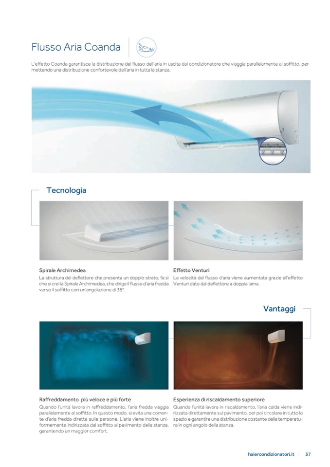 L’effetto Coanda garantisce la distribuzione del flusso dell’aria in uscita dal condizionatore che viaggia parallelamente al soffitto, per-