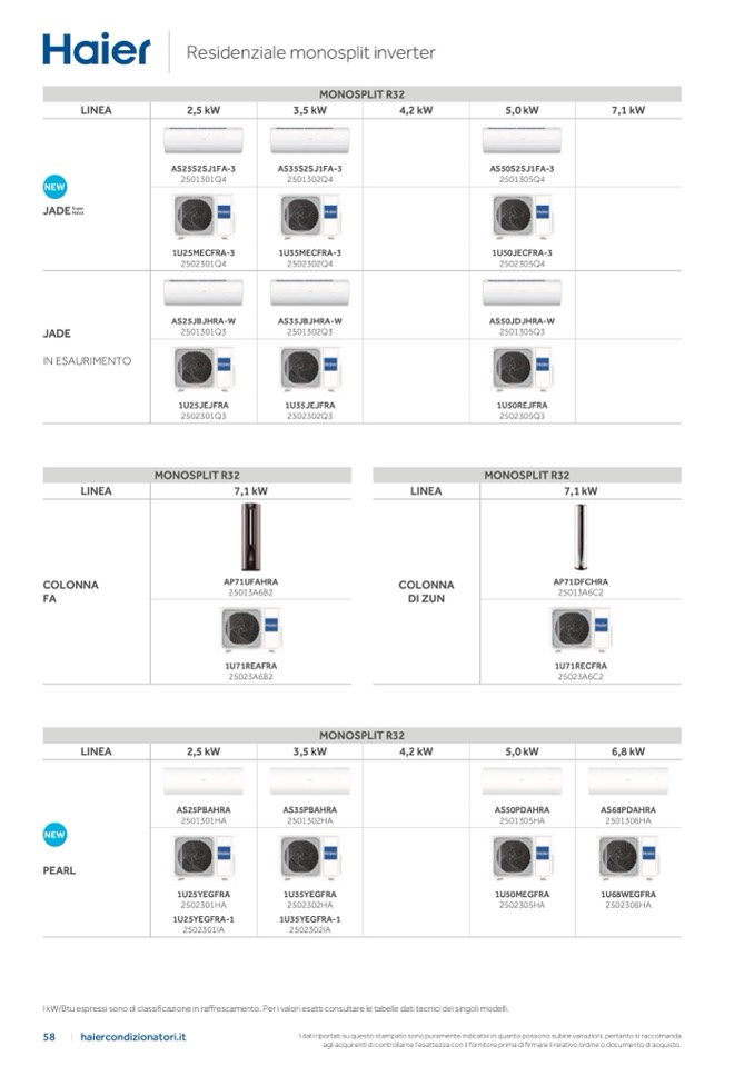 I kW/Btu espressi sono di classificazione in raffrescamento. Per i valori esatti consultare le tabelle dati tecnici dei singoli modelli.