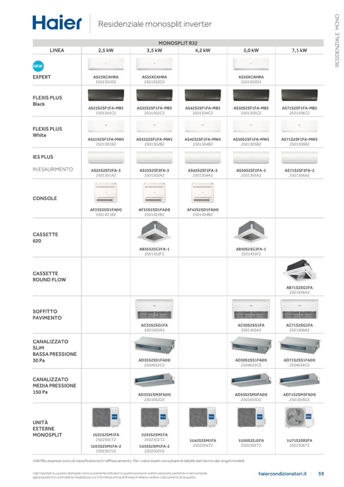 I kW/Btu espressi sono di classificazione in raffrescamento. Per i valori esatti consultare le tabelle dati tecnici dei singoli modelli.
