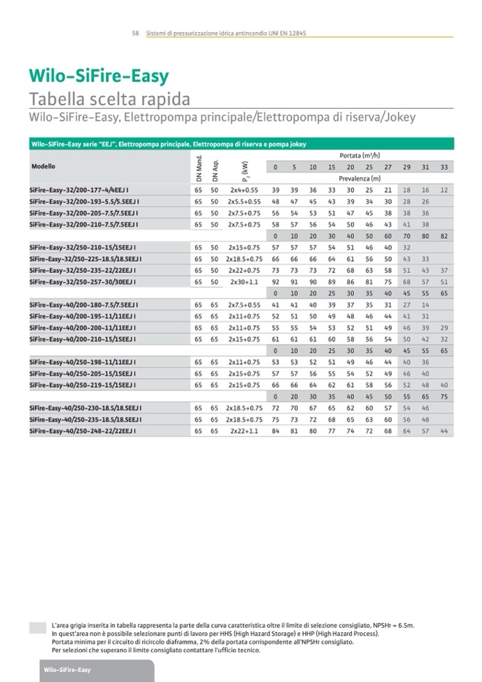 L’area grigia inserita in tabella rappresenta la parte della curva caratteristica oltre il limite di selezione consigliato, NPSHr = 6.5m.