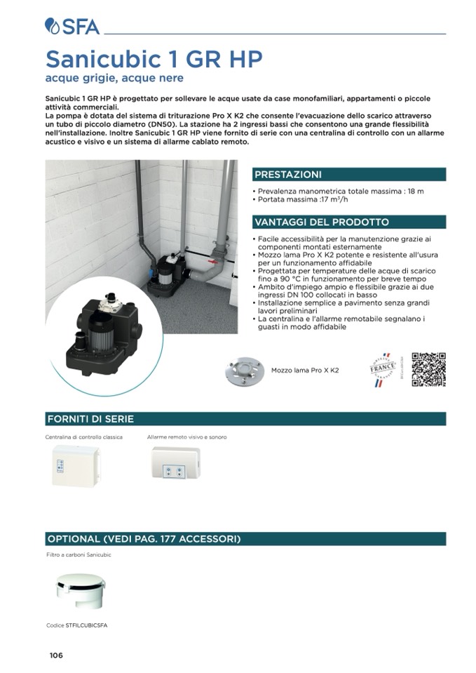 nell'installazione. Inoltre Sanicubic 1 GR HP viene fornito di serie con una centralina di controllo con un allarme