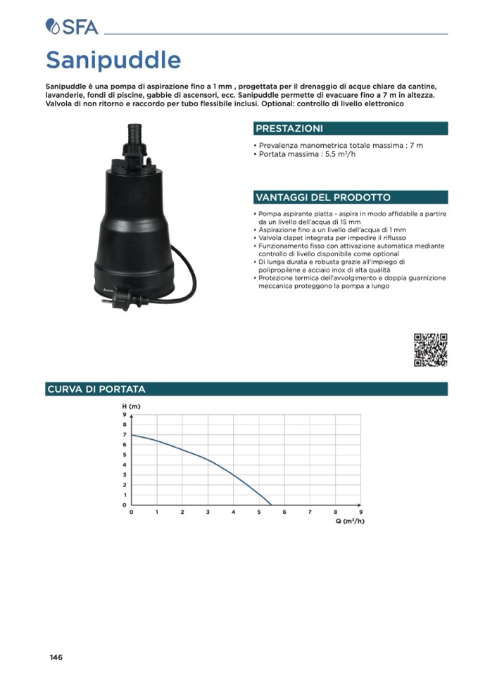 Sanipuddle è una pompa di aspirazione fino a 1 mm , progettata per il drenaggio di acque chiare da cantine,