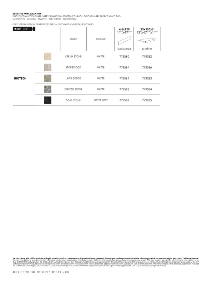 In relazione alle differenti tecnologie produttive l’accostamento di prodotti con spessori diversi potrebbe presentare delle disomogeneità, se ne sconsiglia pertanto l’abbinamento.