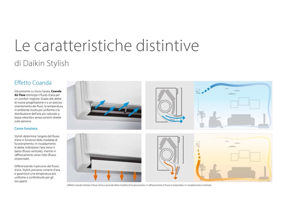 L’effetto Coanda indirizza il flusso d’aria a seconda della modalità di funzionamento. In raffrescamento il