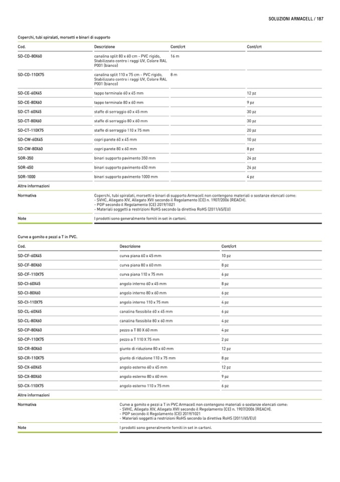 Coperchi, tubi spiralati, morsetti e binari di supporto Armacell non contengono materiali o sostanze elencati come: