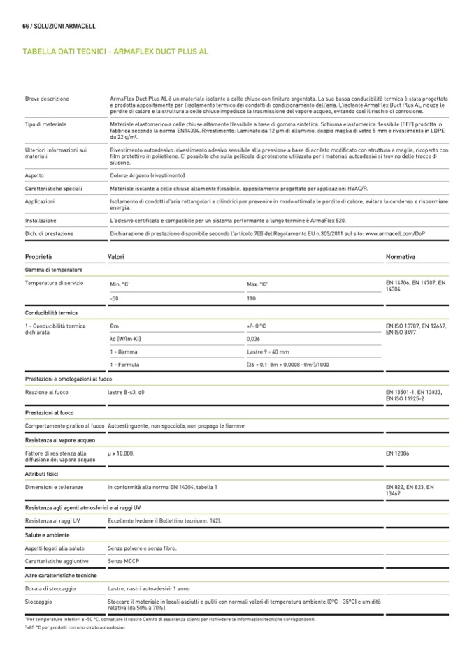 Dichiarazione di prestazione disponibile secondo l'articolo 7(3) del Regolamento EU n.305/2011 sul sito: www.armacell.com/DoP