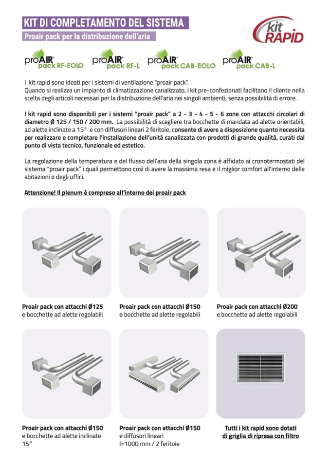 I kit rapid sono disponibili per i sistemi “proair pack” a 2 - 3 - 4 - 5 - 6 zone con attacchi circolari di