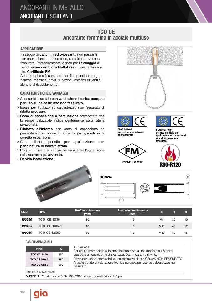 Articolo dotato di valutazione tecnica europea per uso su calcestruzzo non