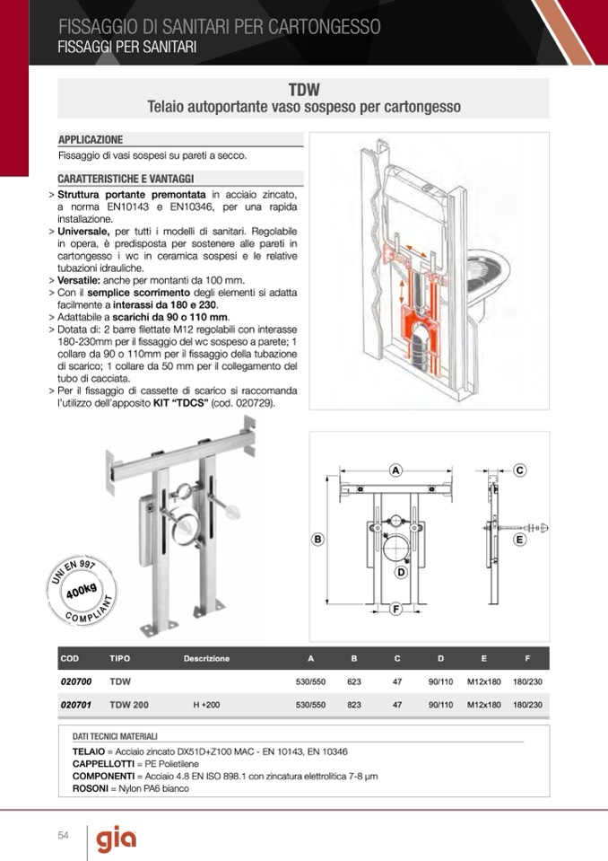 180-230mm per il fissaggio del wc sospeso a parete; 1
