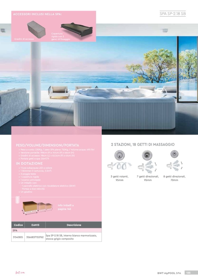 » Peso a vuoto: 230Kg / peso SPA piena: 720Kg / Volume acqua: 490 litri