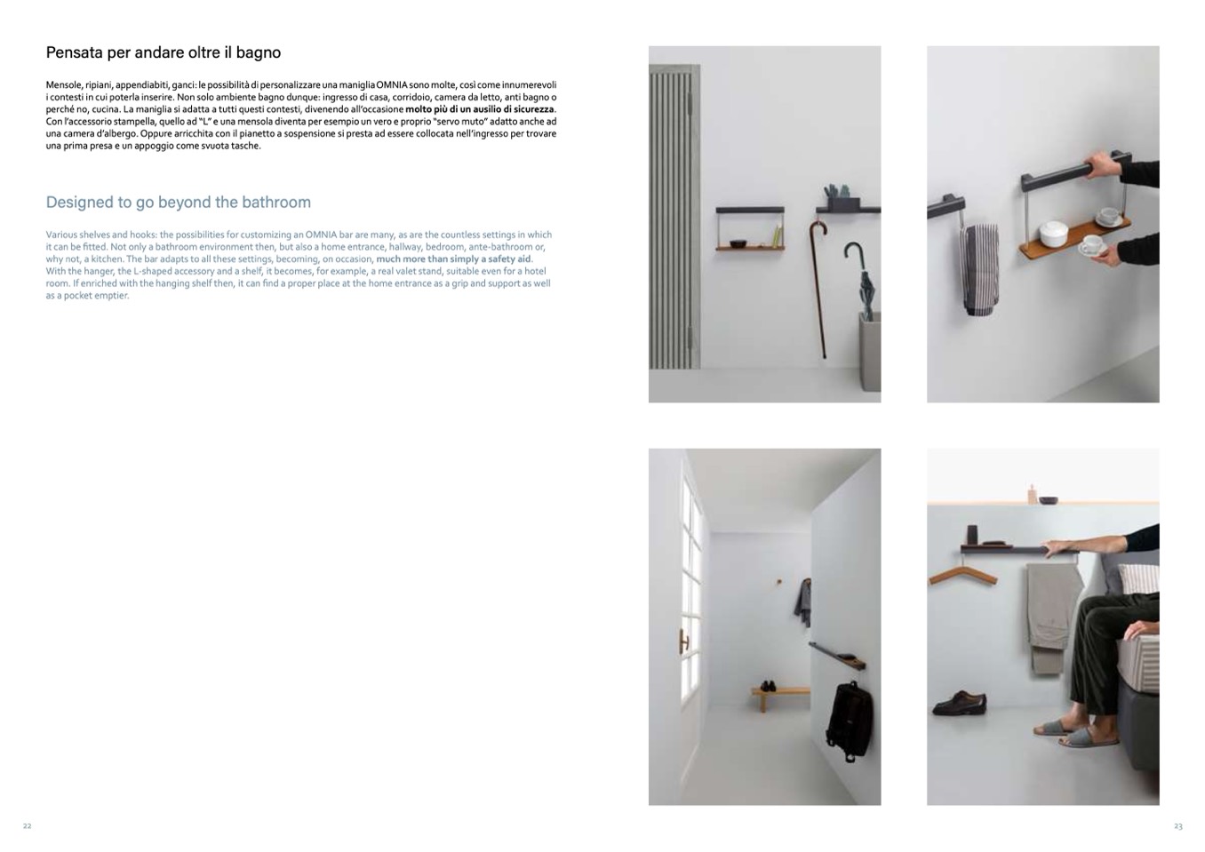 Mensole, ripiani, appendiabiti, ganci: le possibilità di personalizzare una maniglia OMNIA sono molte, così come innumerevoli