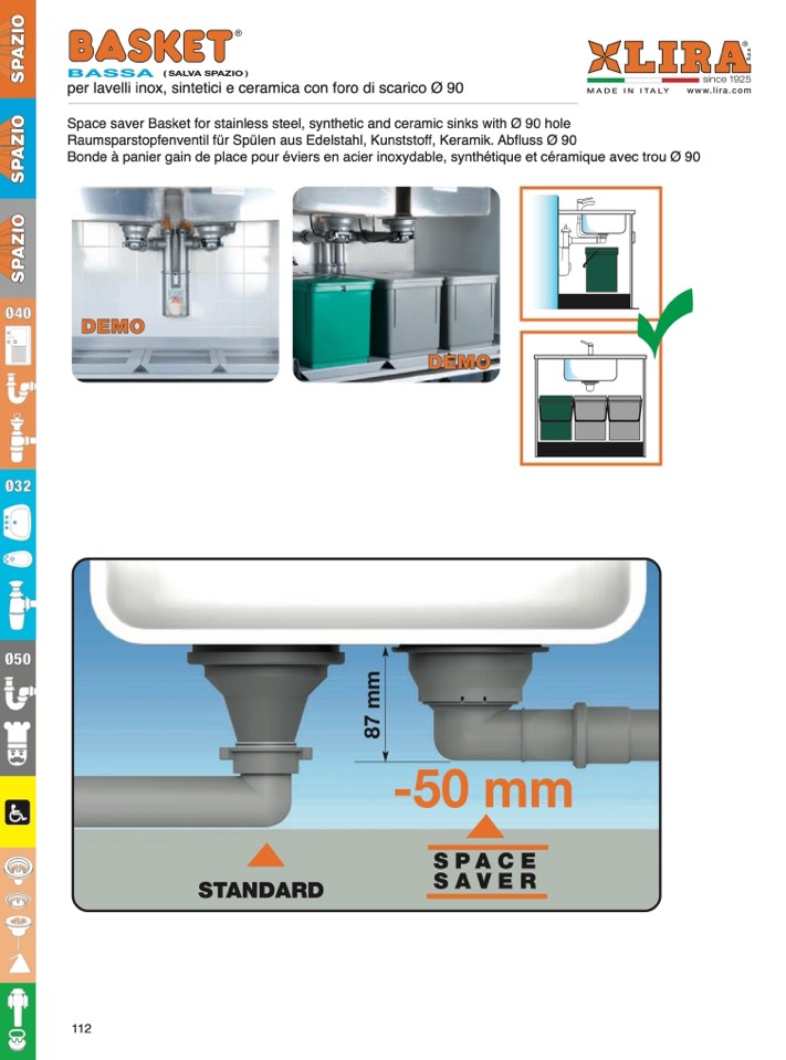 Space saver Basket for stainless steel, synthetic and ceramic sinks with Ø 90 hole